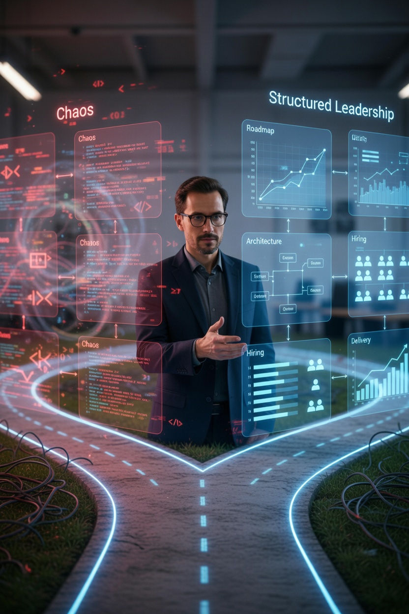 | Scale ($1M+ with team leadership needs) | Team leadership + strategy | CTO Partner ($10K–$12K/mo) |